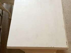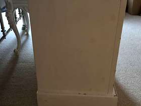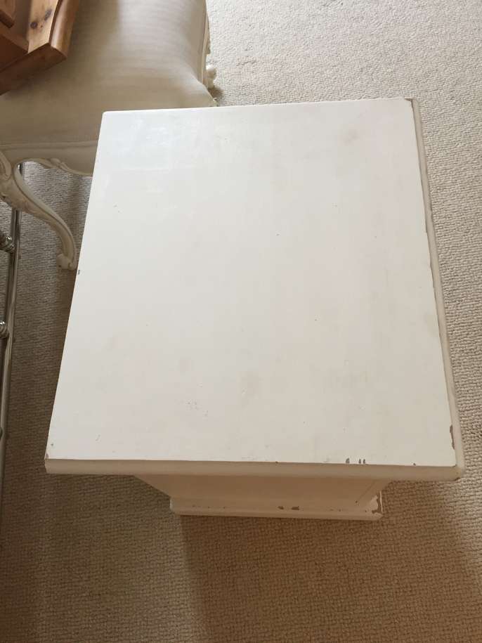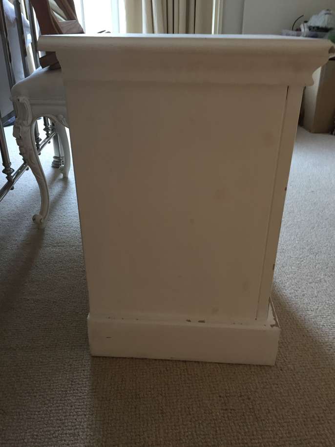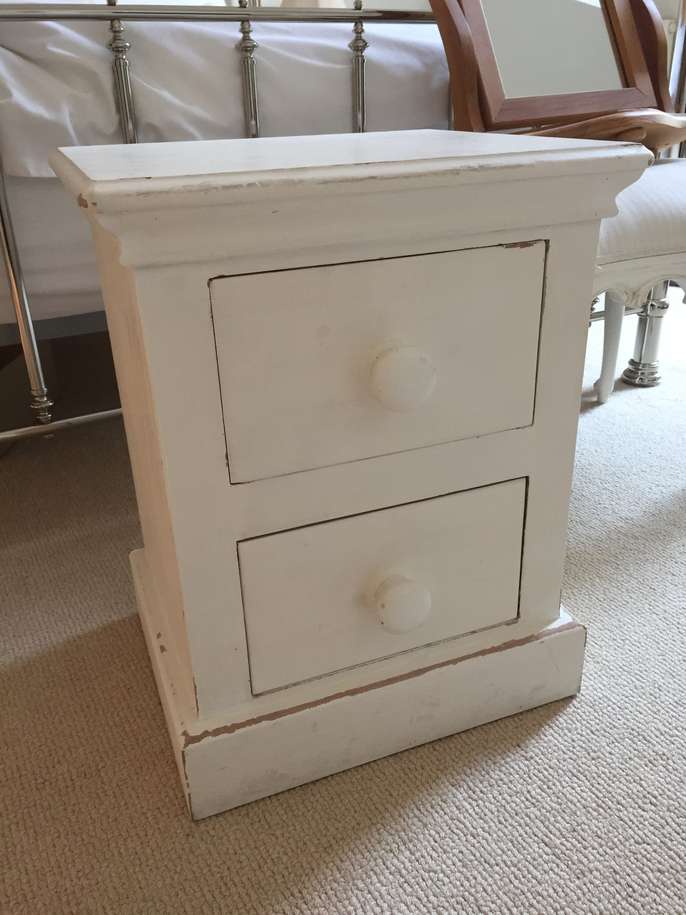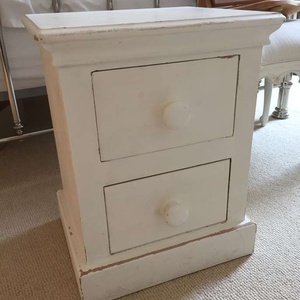 Hand painted bedside table with 2 drawers finished in white chalk paint for distressed look. 57cm high, 44cm wide, 38cm deep. Collection Chiswick.