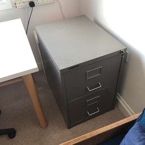 Two drawer filing cabinet, lockable, with some hanging file drops. Approx: 62h x 47w x 70d. Collection only please.