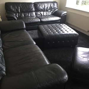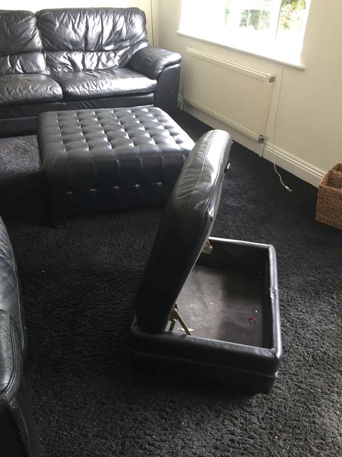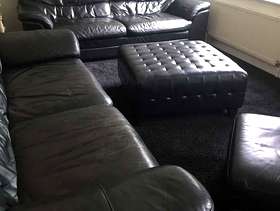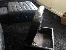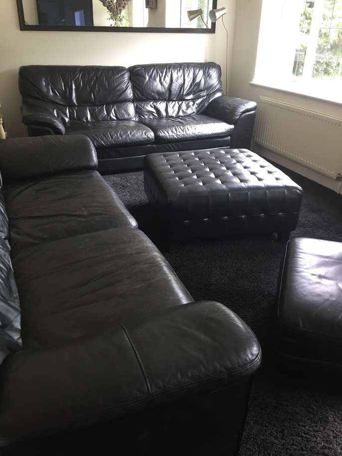Black large used leather sofas, used but well cared for, plus large footstool and smaller footstool with storage