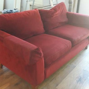 Matching sofas Modern in style with nice wooden shaped feet. Deepish red. Very comfy . Used but in good condition