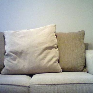 2 seater DFS Rubix design sofa. Very comfortable. Biscuit colour. 3 scatter cushions. 2 brown one biscuit