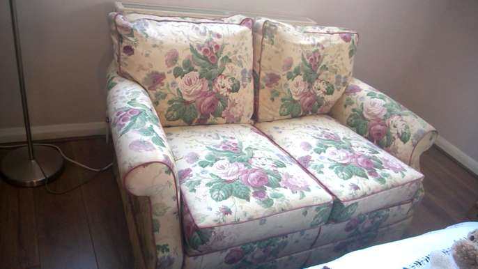 2 seater sofa that came with our house when we moved in. It isn't modern, but doesn't appear to have been heavily used. Solid, with thick cushions, on good castors and in good overall condition, except that it needs cleaning and maybe new covers. Approx dimensions - W 1450mm, D 950mm, H 800mm.