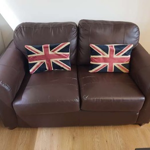 Brown leather 2 Seater sofa with 2 Union Jack Cushions. Must be able to collect