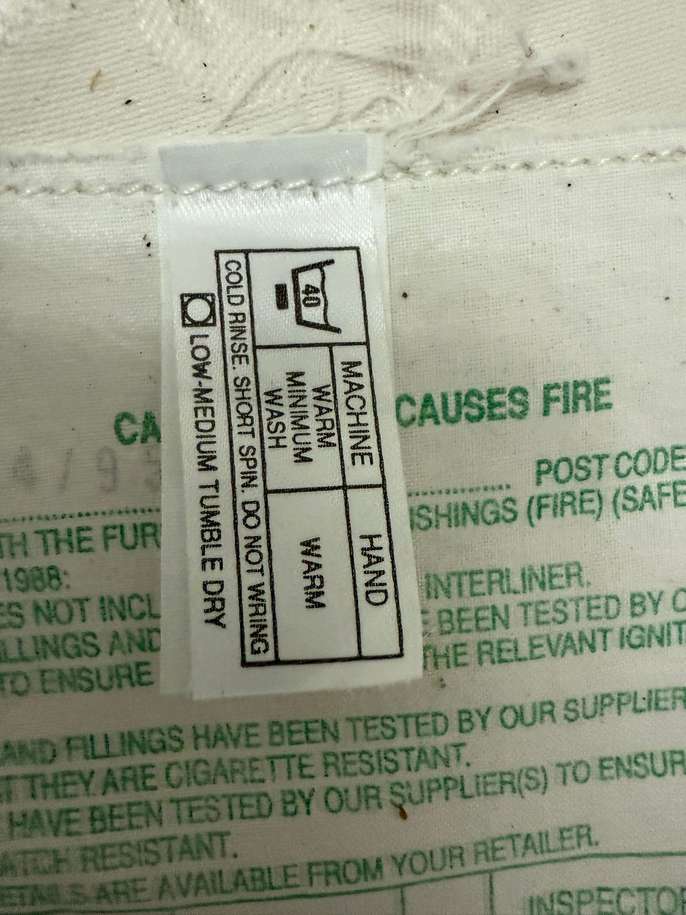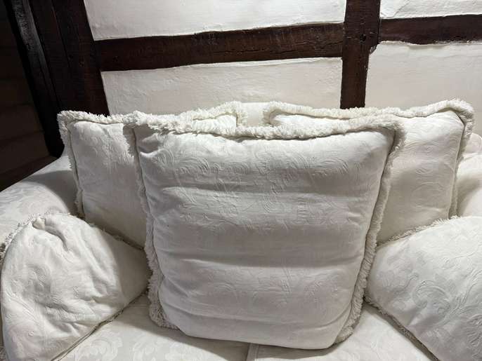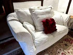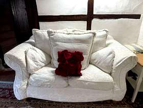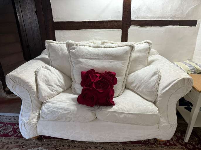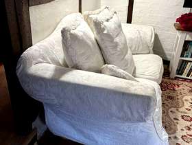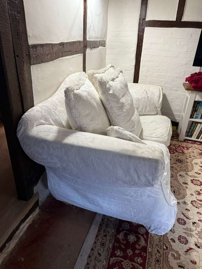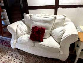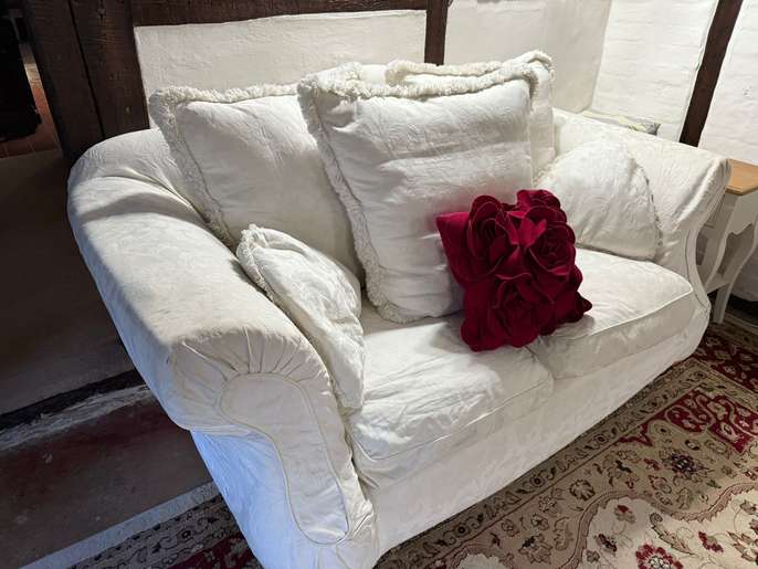 White patterned sofa, feather filled love seat, removable cushions and washable covers. Whoever can pick up the quickest from Coneyhurst will win the bid. 1m 80 cm wide, 100 cm depth and 97cm at highest point