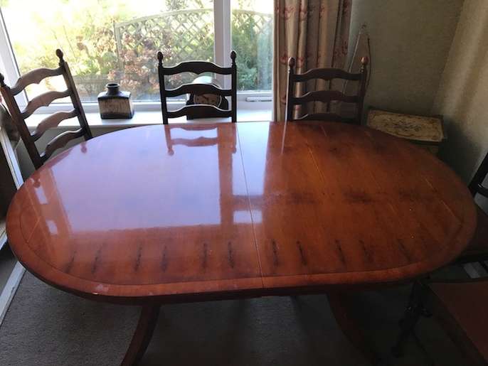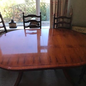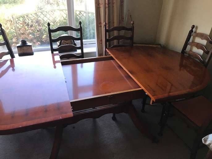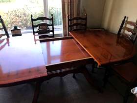 I have 2 extending dining tables both are double pedestal I have attached a photo of one but both are the same style and extend to about 8feet so you could get 10 round it for Christmas. Chairs are not included