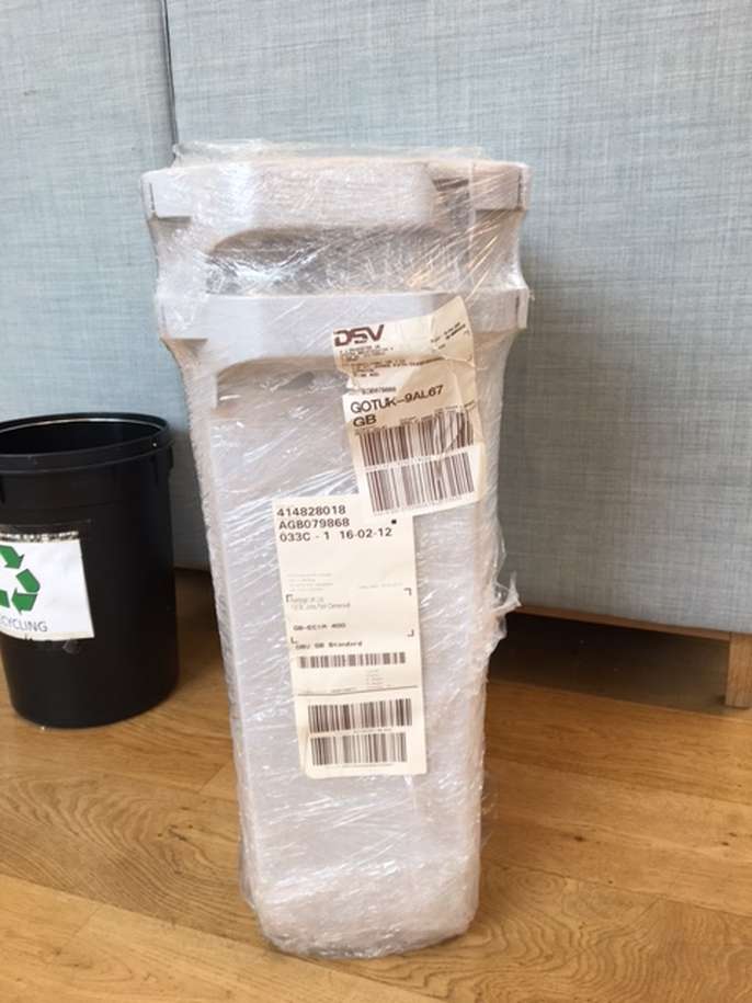 We have two recycling bins to give away, from our office in Clerkenwell/Farringdon. They are unused (wrapped) Without lids Durable Dimensions: Width: 27.5cms Depth: 52cms (without handles) Depth: 55cms (with handles) Height: 60cms Capacity: 60 Litre Will separate! Must be picked up within office hours: Monday-Friday between 9.30am and 5.30pm. Lids can be purchased from AJ Products: https://www.ajproducts.co.uk/bins-waste-containers/recycling-containers/3979499.wf Thank you, Sarah.