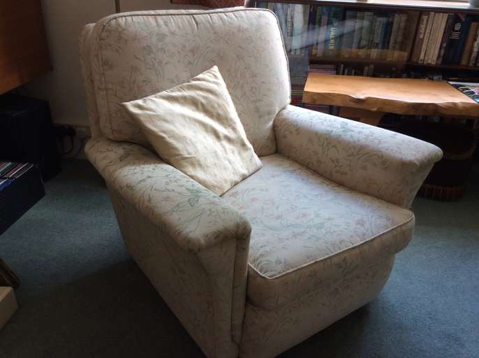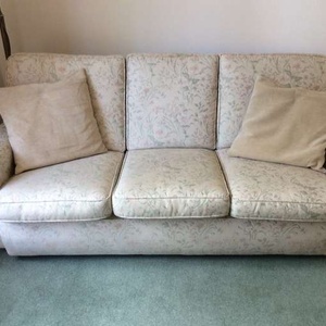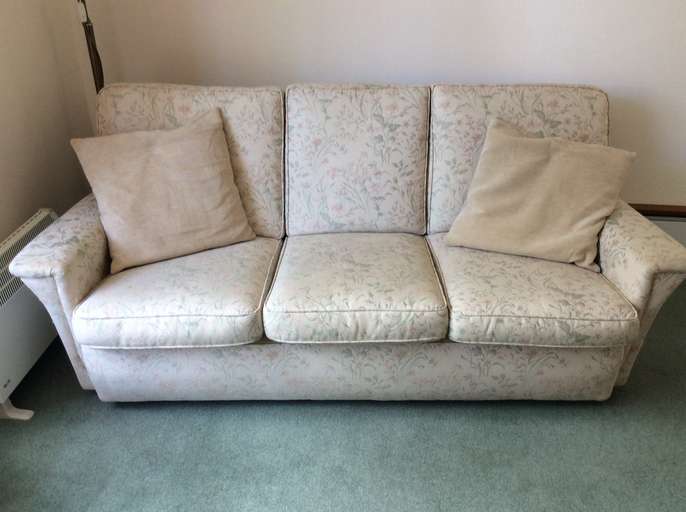 THREE PIECE SUITE. Sofa 184cm wide, 94cm deep. Each chair 85cm wide, 94cm deep. Very comfortable, and very good condition. Colour: cream, with pale green/pink pattern. Must find good home due to downsizing furniture.