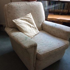 THREE PIECE SUITE. Sofa 1840cm wide, 940cm deep. Each chair 851cm wide, 940cm deep. Very comfortable, and very good condition. Colour: cream, with pale green/pink pattern. Must find good home due to downsizing furniture.