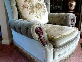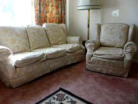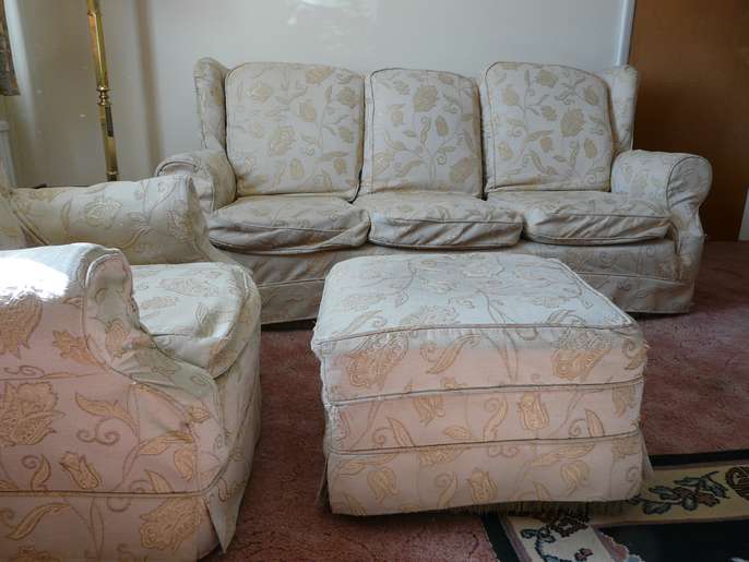 3 Piece Suite - FREE (2 armchairs, a 3 seat sofa plus large square footstool) Light Green colour with floral pattern detail and wood finish to arm rests Includes removable recover material for all pieces - shown on sofa, 1 chair and footstool as example