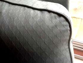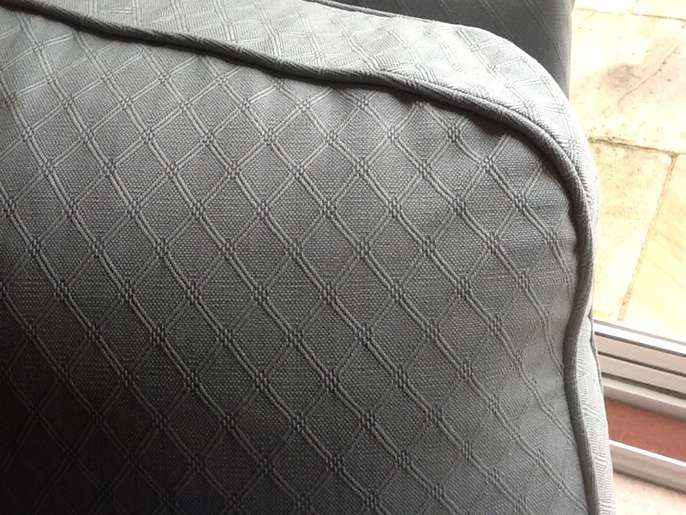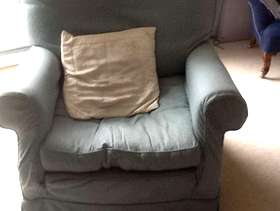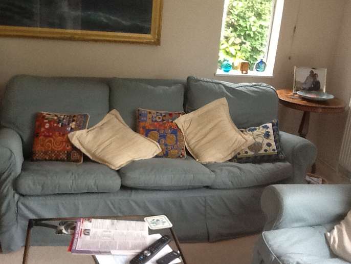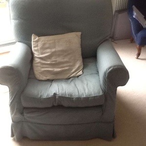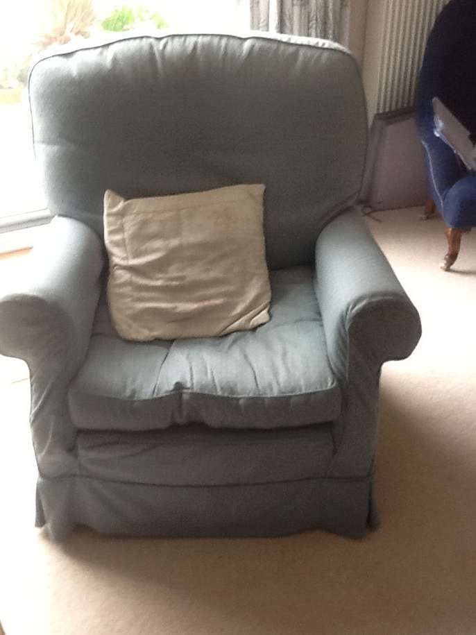 3 seater sofa and 2 arm chairs classic style with loose covers in duck egg linen. Fire safety labels. Feather back cushions synthetic seat cushions. Comfortable