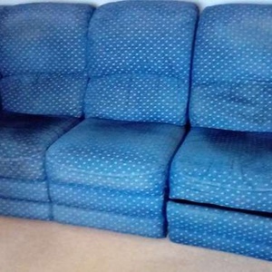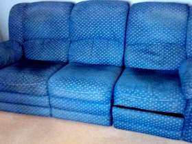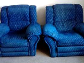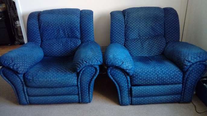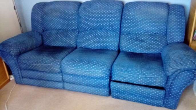 Large comfortable 3 seat sofa with manual recliner at one end, 1 chair manual recliner and 1 chair. Dark blue with gold pattern. Sofa splits into 3 for easy carrying. Sofa recliner stiff but working.