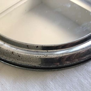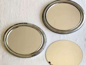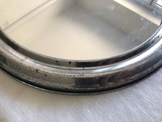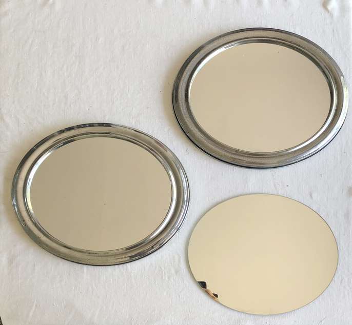 3 round mirrors two with metal frames which are a bit tarnished and in need of a light rub down and coat of paint, the third has no frame, measuring 12 inches in diameter without frame and approx 14 inches in frame. Collection from Sidmouth