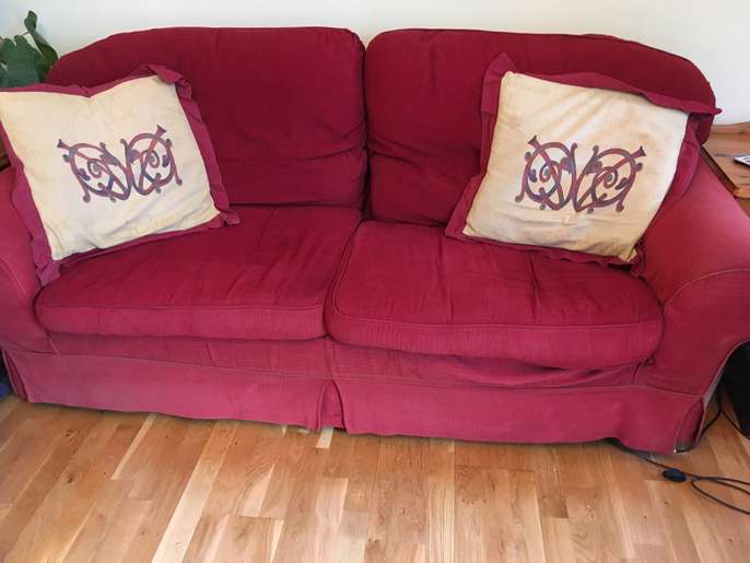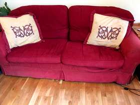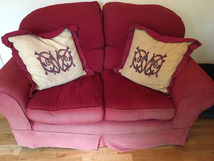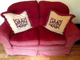 DFS large sofas (Lorenzo) in cranberry colour with patterned scatter cushions. In good condition but some removable covers and seat cushions a little faded. 3 seater - 216 cm long X 64 cm deep X 100 cm high 2 seater - 164 cm long X 64 cm deep X 100 cm high Collect only