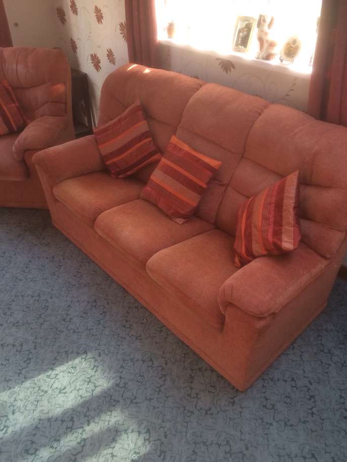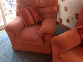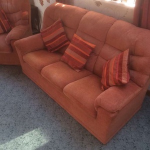 Terracotta colour, all covers detachable, in good condition apart from some fading on the top back cushion of chair.