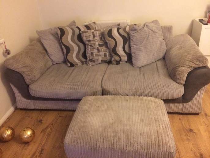 3 seater grey sofa, scatter back cushions and pouffe. Few marks but still a lovely sofa! Collection only need gone by tomorrow!