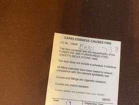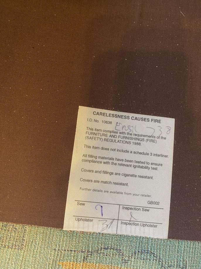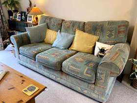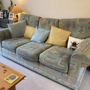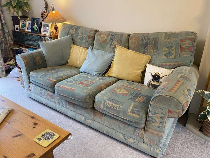 3-seater settee. Good condition, no tears or rips, no worn patches. Fire safety label present. Bumble bee cushion not included! :)