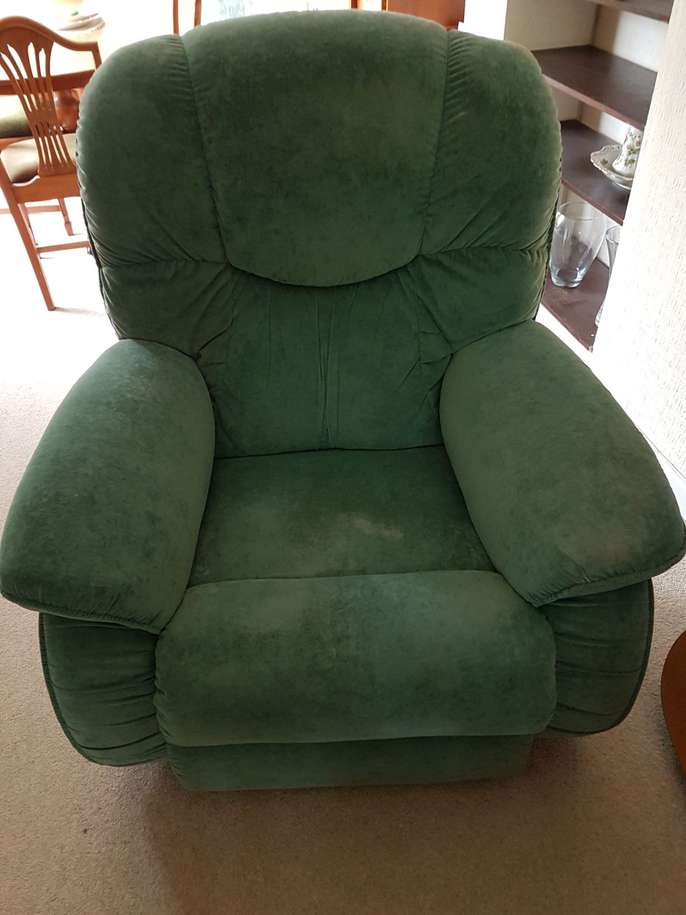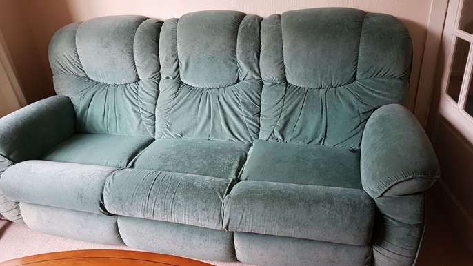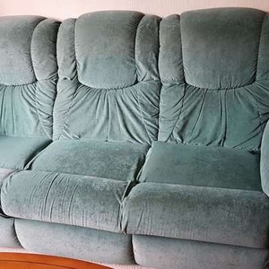 Brushed velvet effect teal green coloured settee and two chairs. Settee and one of chairs in good condition with remaining armchair having loss of some material on armrest. This armchair is a recliner chair with full working recliner feature. Settee originally purchased 2000. Photos to follow. Will need to be collected as no way to deliver