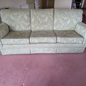Large 3 seater sofa. Reupholsted 4 years ago. Good condition. Hardly used. Free to collector, too big as downsizing. 2m40cm long, 90cm deep, 95cm high. No fire retardent labels, but re-upholsted in fire retardent materials.