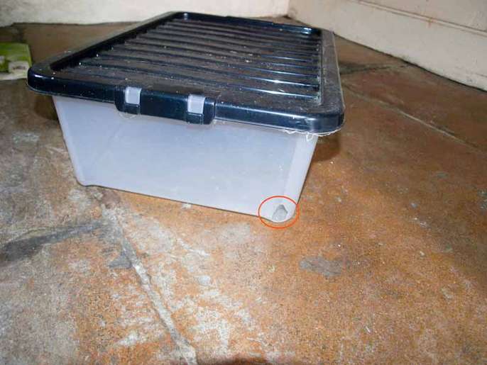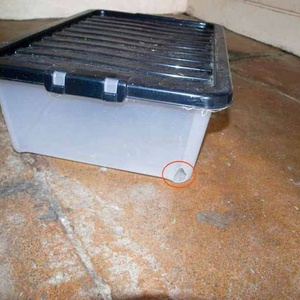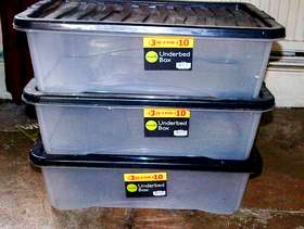 390 mm wide x 590 mm long x 170 mm high, black snap-on lids One of them has a small hole in one bottom corner (see photos!)