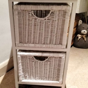 3 small wooden framed bedside tables/side tables with wood and wicker drawers Matte white. Measurements are 56H x 34D x 26D Sturdy, just need some tlc. ASAP from GU14RU