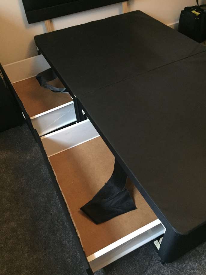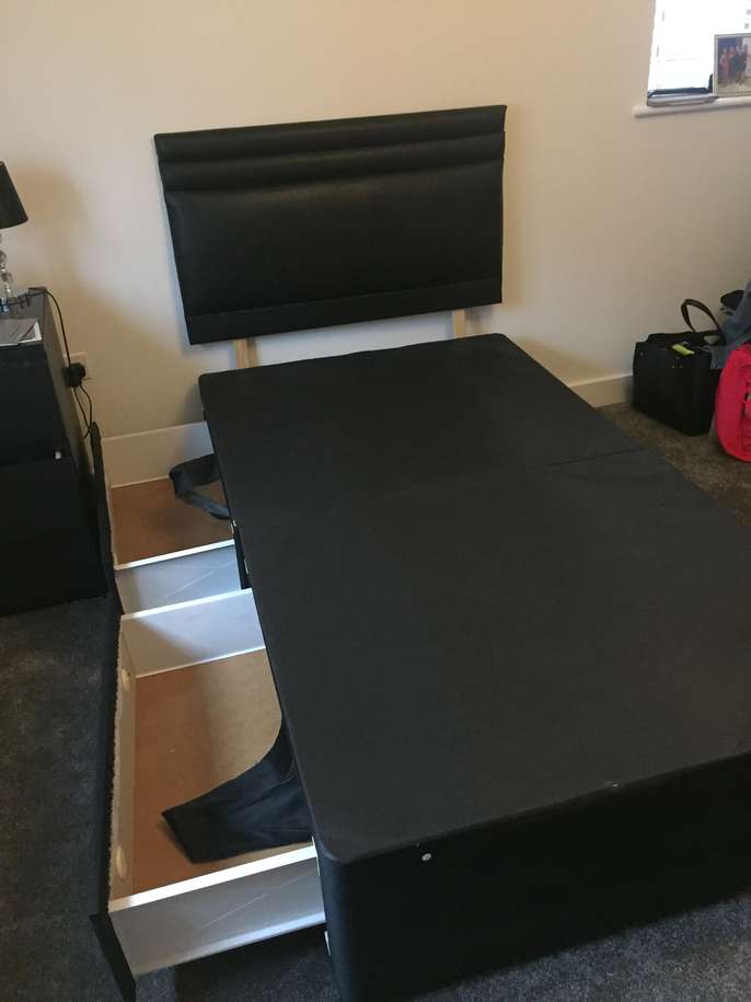 Black divan bed with 2 drawers and a headboard, no mattress Base comes in 2 halves Free to collect from Buntingford
