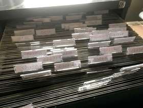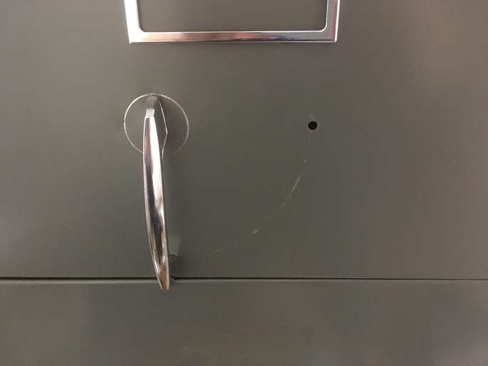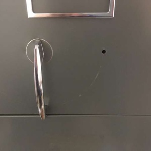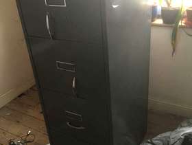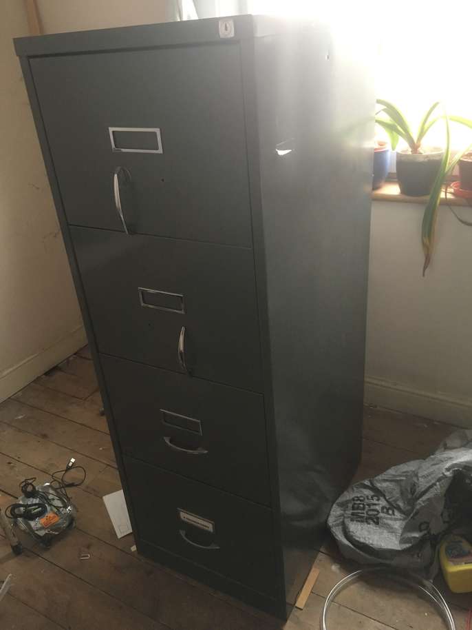 4 Drawer Metal Filing Cabinet, including hanging pockets inside. Handles on 2 of the drawers are hanging from 1 side, but can be easily repaired.