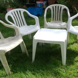 4 plastic chairs and a plastic table