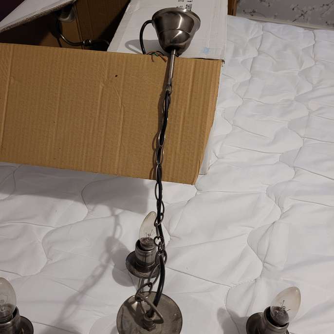 Very good condition and in full working order. No longer needed due to redecorating. Chain length approx 23.5" from top of rose. Matching 3 arm candelabra ceiling pendant light also available. Brushed metal effect, dark grey/pewter colour.