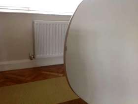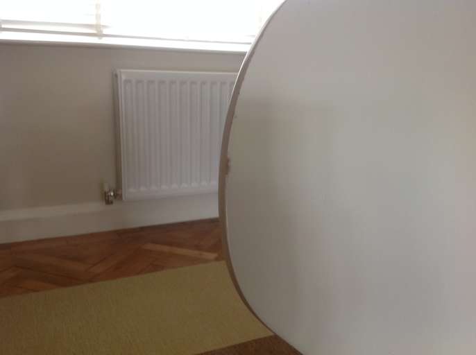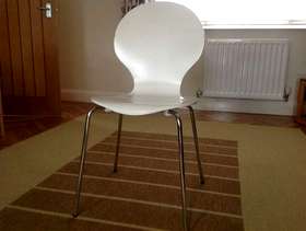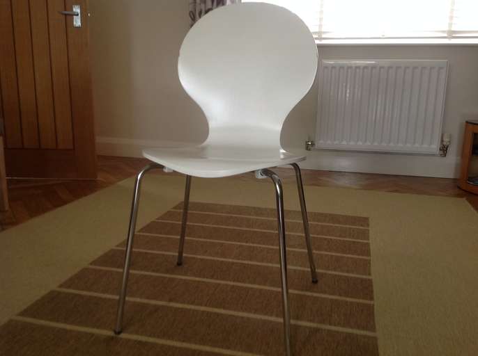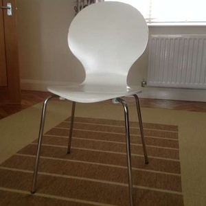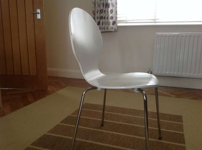 6 white dining room chairs - white wood, shaped one piece seat with chrome legs. Stackable. Good condition - paint chipped at edges on back where they met the table.
