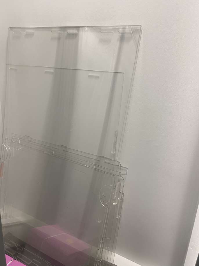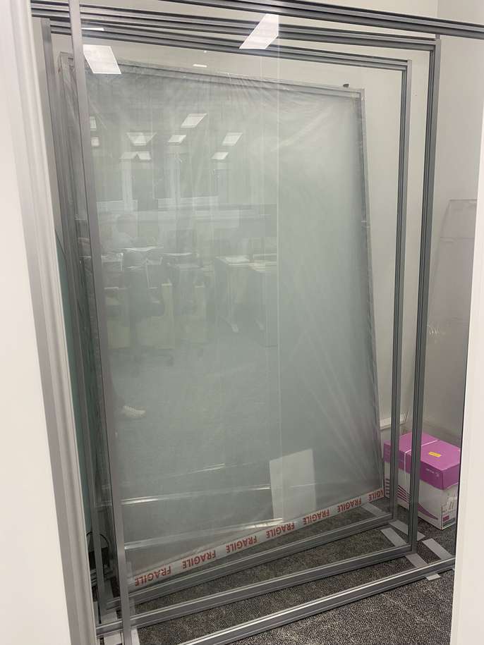 Eight freestanding acrylic screens 1800H x 1200W and eight side & front desk dividers 600 H x 800 W & 600 H x 1400 W. Pickup W1W