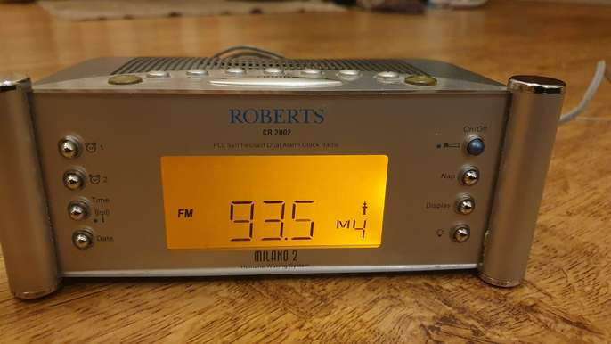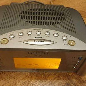 Roberts alarm clock radio all working in good condition, but no longer used. Automatic time setting. 7½inches wide by 6" deep by 3" high