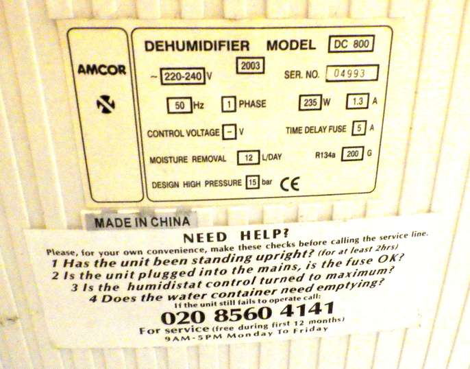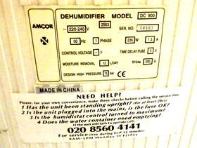AMCOR DEHUMIDIFIER DC 800 WAS WORKING VERY WELL UNTIL RECENTLY, EVERYTHING STILL WORKS BUT NO WATER IN THE RESERVOIR .MAY BE A SIMPLE SOLVE- FREE TO COLLECT FROM LEEK contact jeremyknight@mac.com