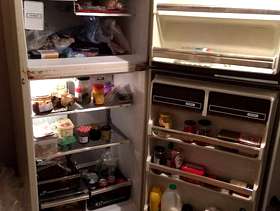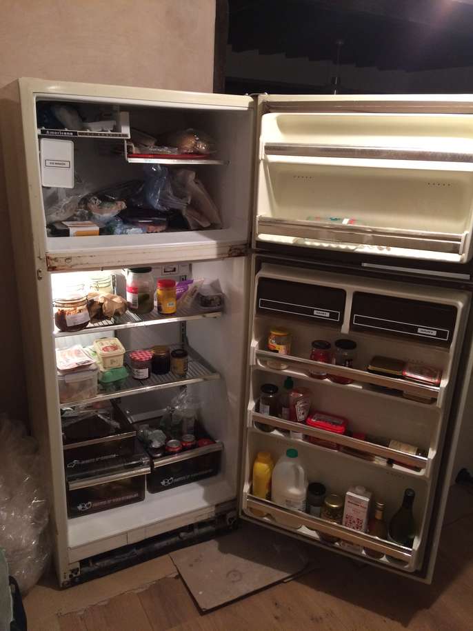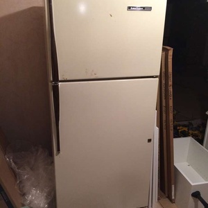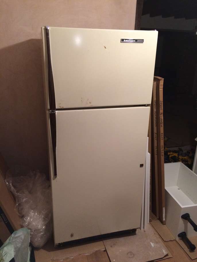 GE American Fridge Freezer in fetching beige. All working with a few dents and scrapes. Wooden handles! Ice maker! 164 x 72 x 72cm. You need two strong people...