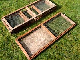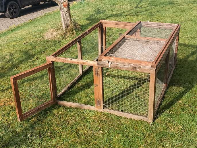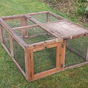Wood and mesh outdoor run for small animals such as guinea pigs or rabbits. Folds flat for storage and transport.