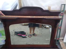 Above fireplace or sideboard top mirror with shelf. Mirror has foxing. Wood surround just needs a bit of s polish. Needs to be collected asap.