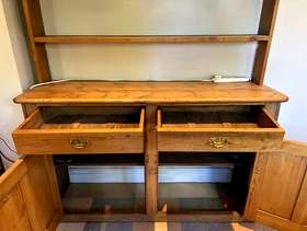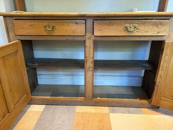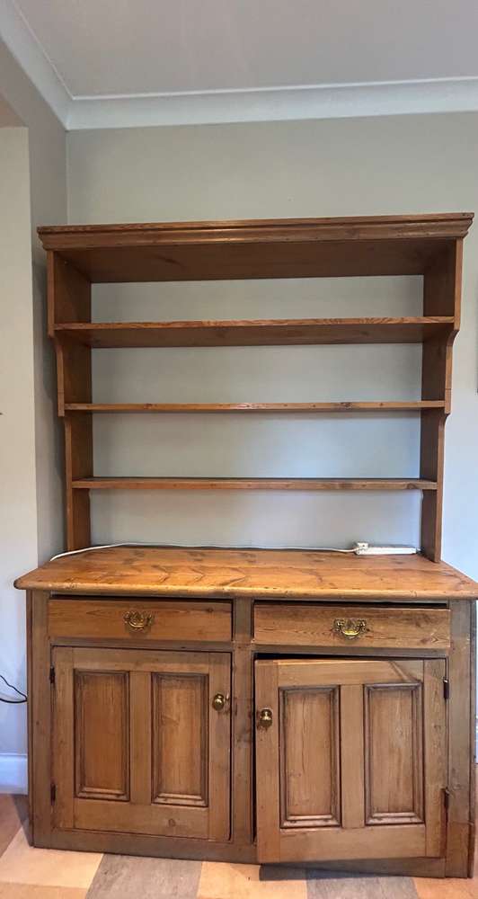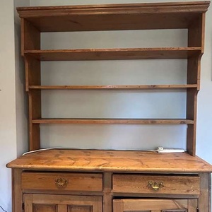 Whilst it may not be genuinely 'antique' this is not a modern dresser, we believe it to be Victorian as it came out of an old house when we acquired it 15 years ago. It is a substantial unit and you will need a van plus two strong people to lift and shift it. It measures: Base unit - width 153cm, depth 46cm, height 90cm Shelf unit (is separate from base) height 122cm, depth 28cm Total height when assembled as shown: 213cm Please note the base is open on the floor and back - as you can see in the photos. We are in Hampton TW12.