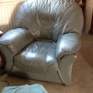 Two petrol green leather armchairs . Very comfortable , and many years of life left in them , too good to go to the tip !