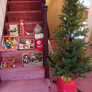 5ft artificial Xmas tree, very good condition. Large box of decorations including baubles etc & fairy for the top.