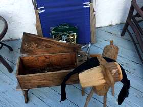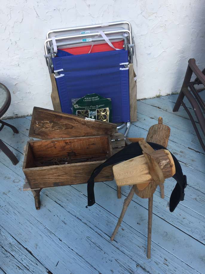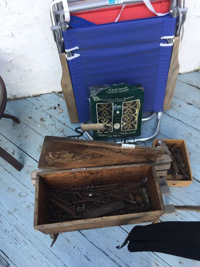 Antique tool box ... lots of Allen wrenches rusty old tools , garden bench for elves .... brass floor register (2)... sand chairs for the beach .... picnic condiment holder ...