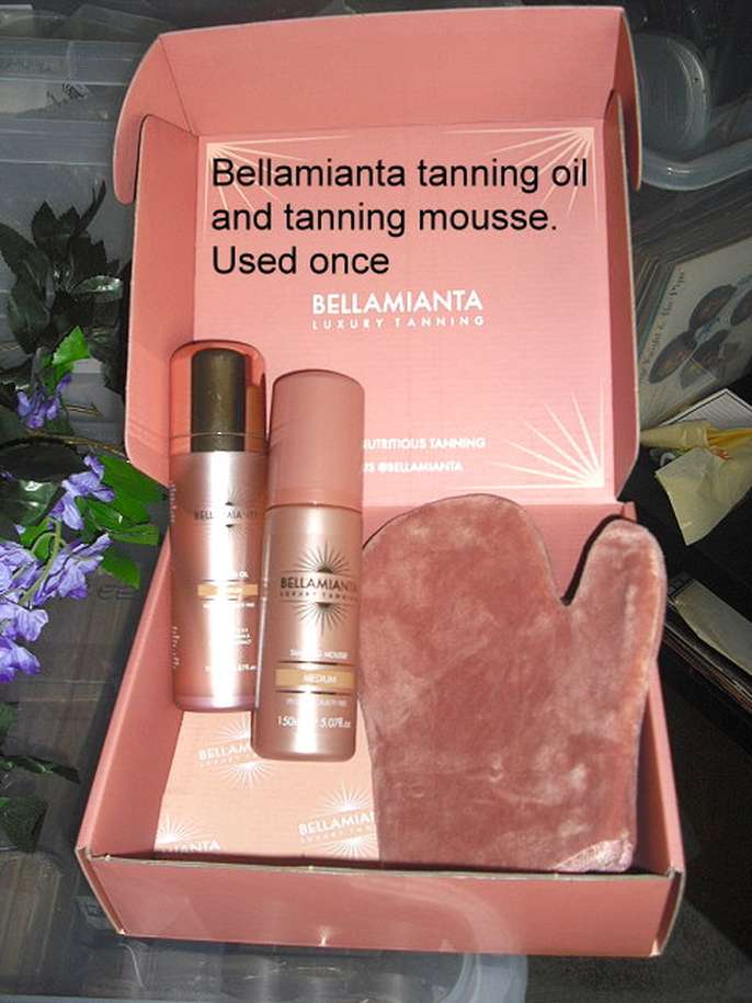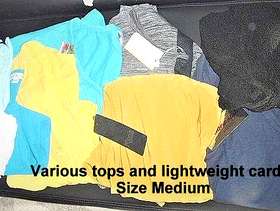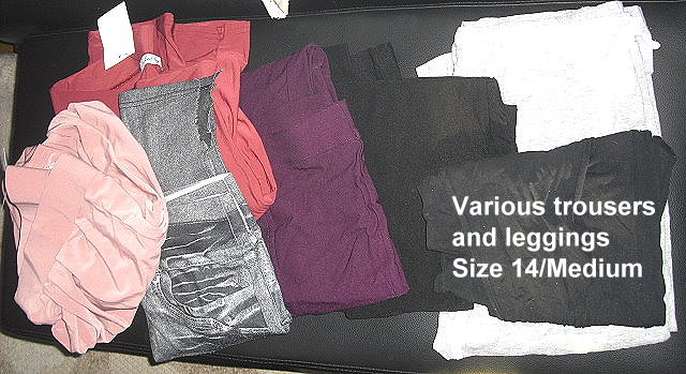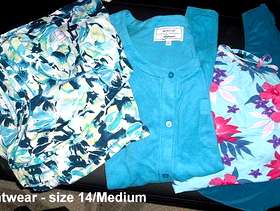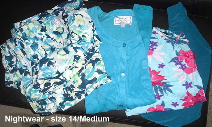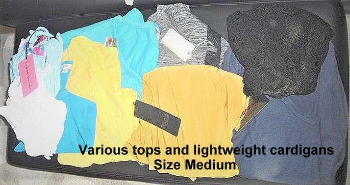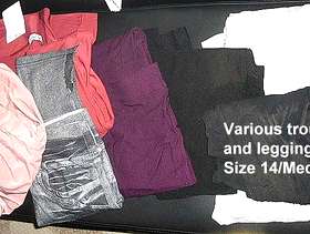 Assortment of clothes (trousers, nightwear, tops), costume jewellery, shoes/sliders, bags, odds and ends and tanning lotion. Some items have never been worn/used and have the label still on. All items in very good condition. Clothes are size medium Shoes are size 6