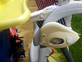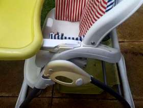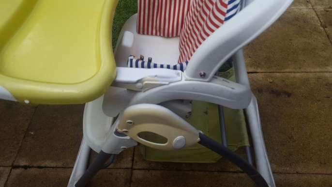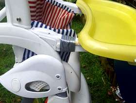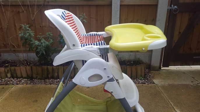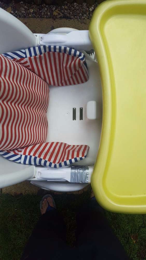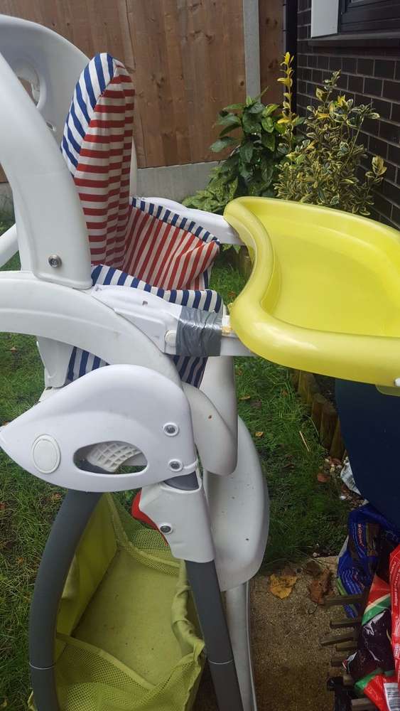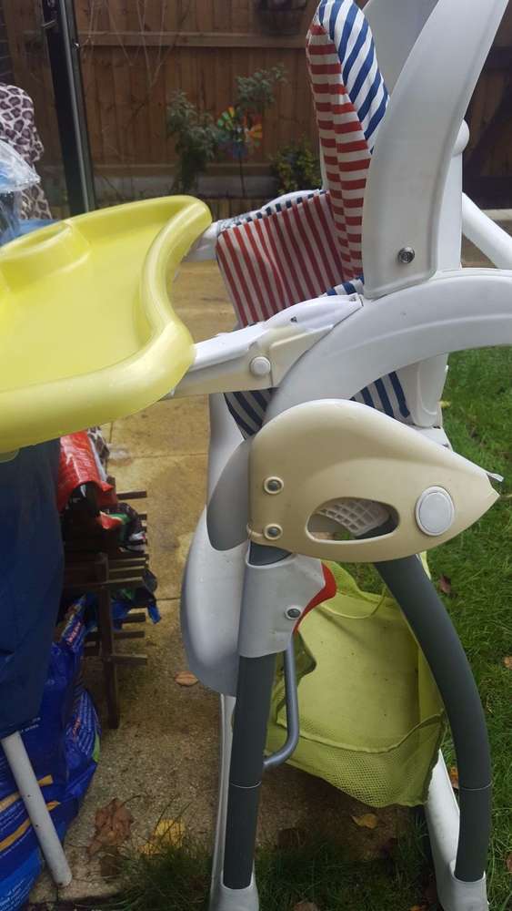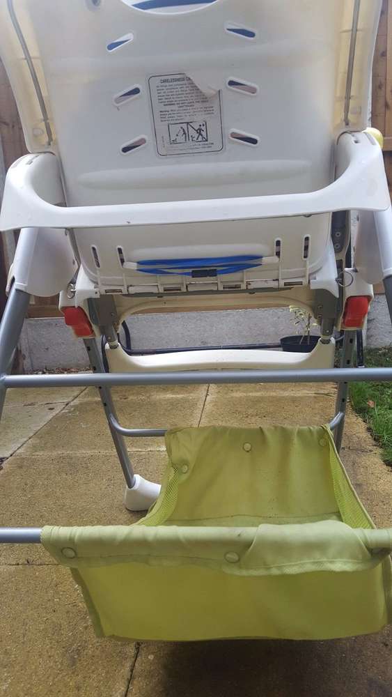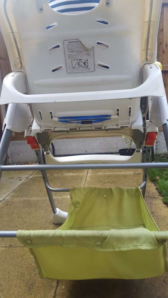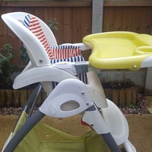 Mamas and Papas Baby High chair for 2 to 4yr old kids - Foldable chair with basket at bottom for kids' stuff. The original back cushion got spoiled. So we replaced it with an Ikea (inflatable internally) washable back-cushion an year back. Right armrest slightly cracked, but works well with a firm-packaging tape around it. Plastic white body is tough and durable. High Chair is foldable and makes for great fit for kids aged few months to 4-5 years. Collection in-person from Sudbury Town, Wembley (HA0)