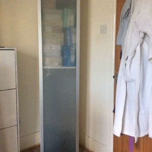 A tall slim bathroom cabinet. It is white with a glass door framed in silver. The cabinet is 37 cm deep x 39 cm wide x 179 cm high. It would be great for a compact bathroom. The door hinge is loose but easily fixed.
