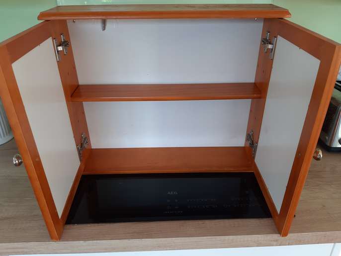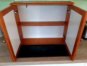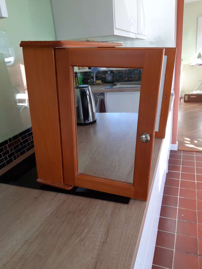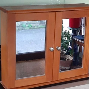 Pine bathroom cabinet with mirror doors. Measures 22"(56cm) wide, 18"(45cm) high, depth 5,"(13cm).