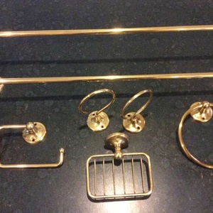 Gold effect towel rail, soap dish holders, toilet roll holder, towel ring.