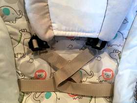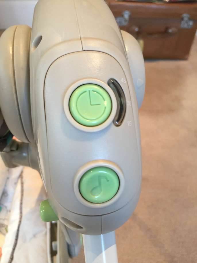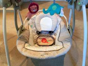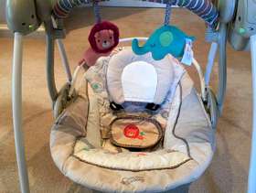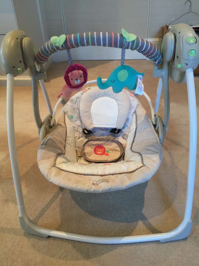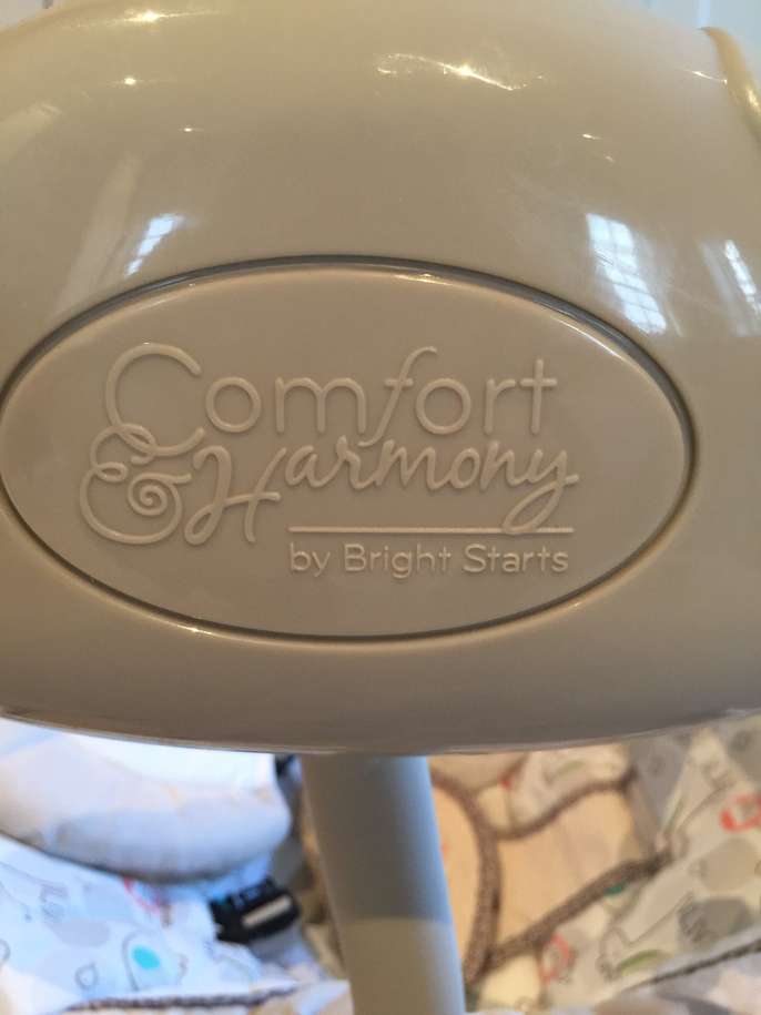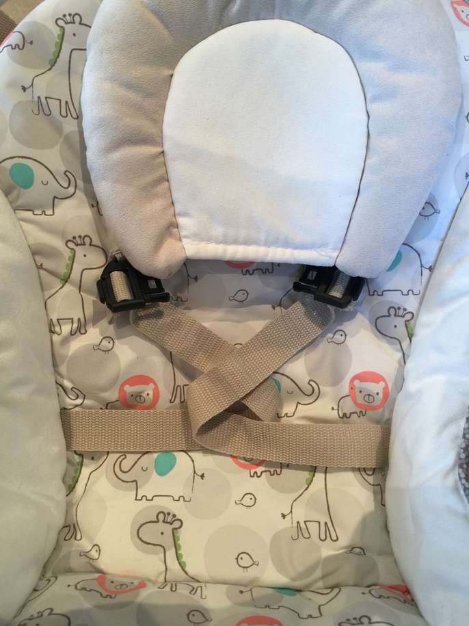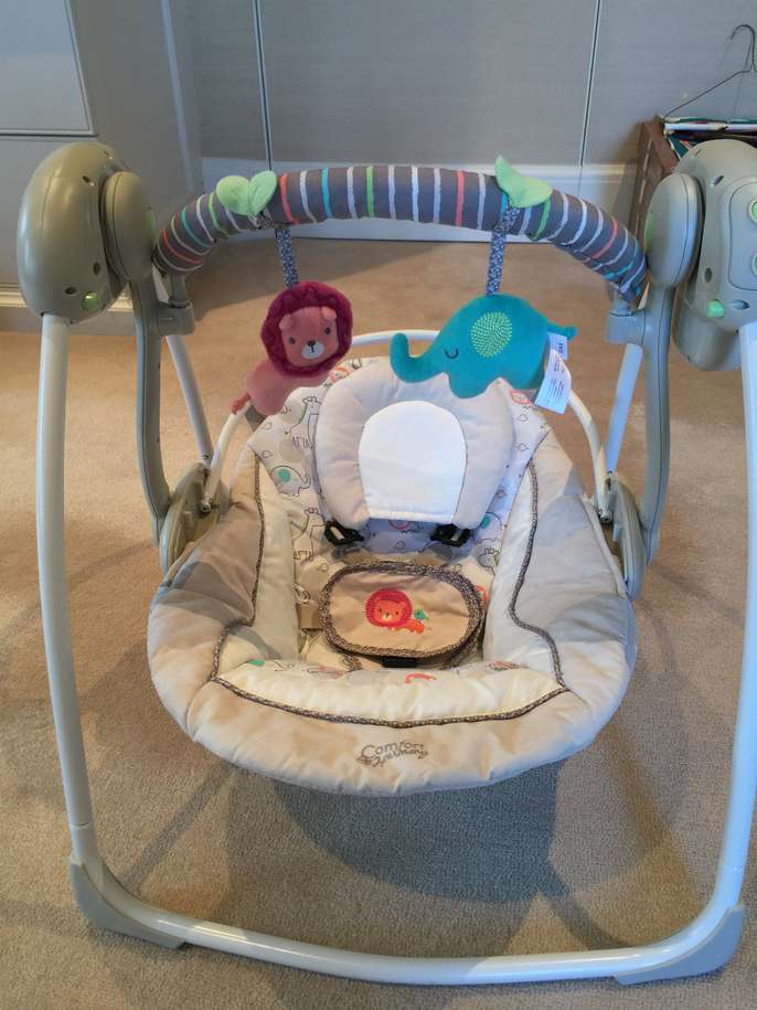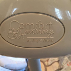 A Comfort Harmony by Bright Starts , rocking seat for infants (depending on baby’s size) up to 4-5 months I think. It is in full working order, very good condition. It has a music button and a timer button (though I don’t know how that one works sorry). The seating is washable and has no stains or marks on it. The rail with the hanging animals is detachable. Hopefully a pregnant Mum or new Mum would love to have it as a great way to settle baby! We are in Englefield Green.