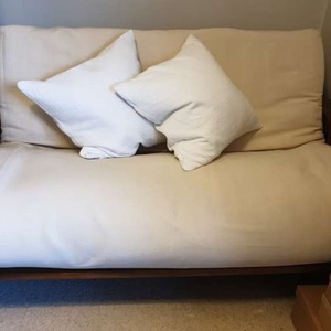 Regrettably we need to give this away as unfortunately there is no space in my sister newly flat . Collected only last Friday (31st January) from another Freecycle fellow. Beautiful futon with cream linen cover and solid wooden frame. Well made, sturdy and elegant piece. Perfect for a calm corner of the house in which to reflect. Seats / sleeps two. Does creak somewhat when sleeping. Bought several years ago as an extra bed for guests but used infrequently. Minimal wear and tear, no stains. Mattress has been turned regularly so in good shape. It needs to go asap. Collection from Walton-on-Thames (1st floor) today or evenings, thanks.