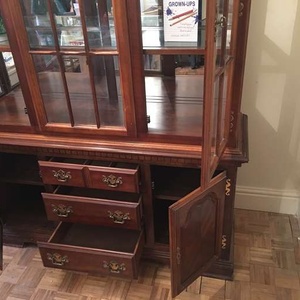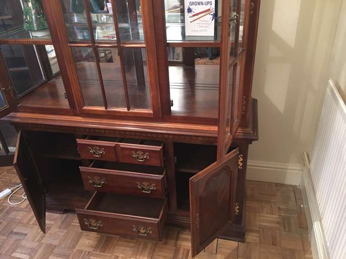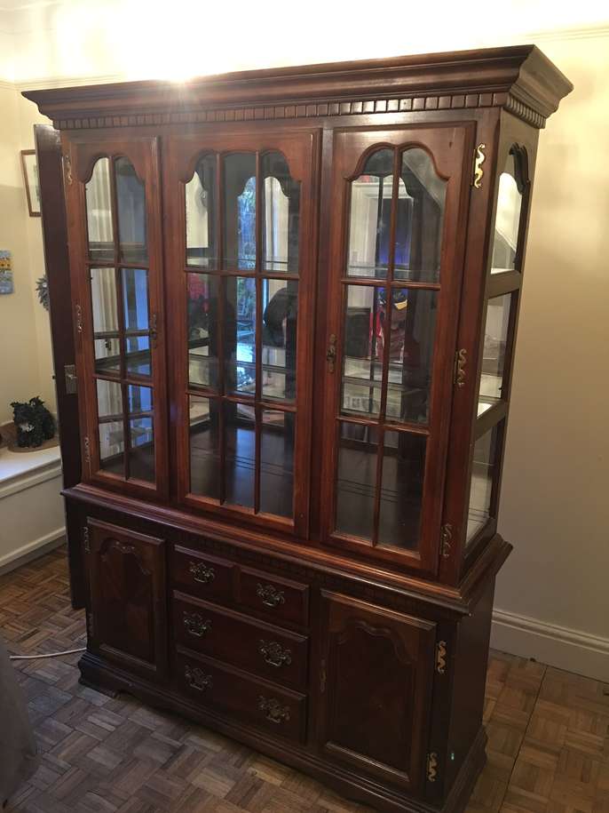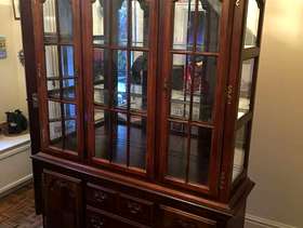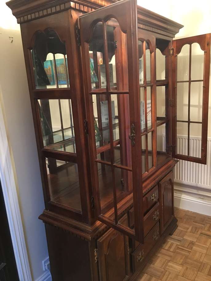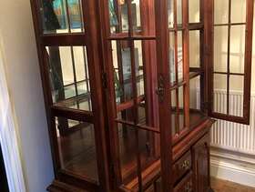 Lovely medium brown glossy cabinet with brass fixings. Has a light in the top section which illuminates the top half of the unit. Buyer collects