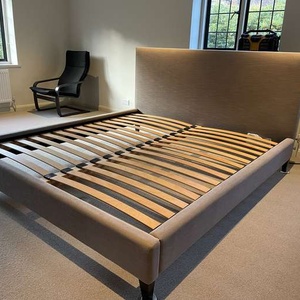 Feather and Black superking size bed frame - beige fabric frame. Will be disassembled for collection.