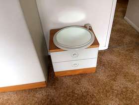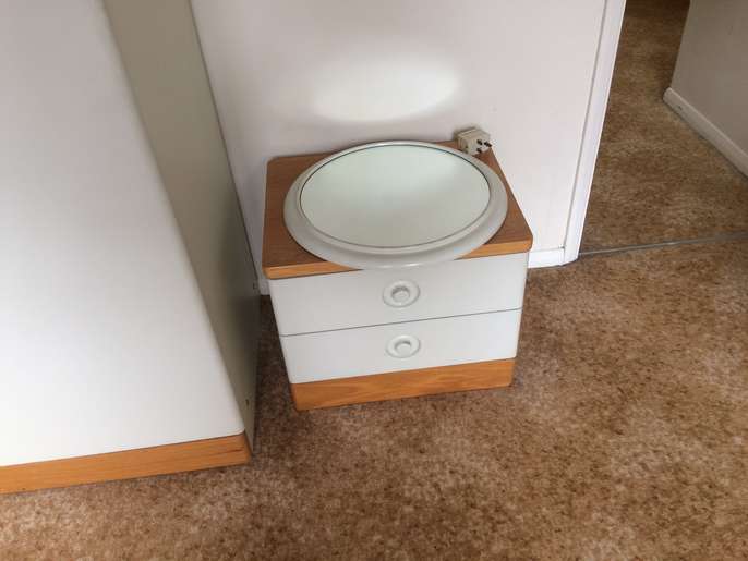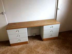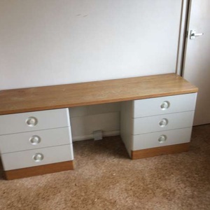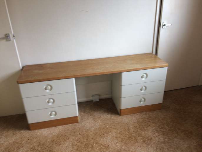 White with pine trim, bedside drawers, and vanity unit with 2 drawers and table top in pine colour. Looks a bit tired but in good condition.