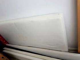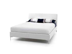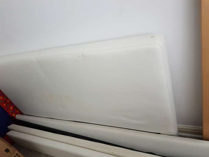 Sturdy kingsize bedframe with cushioned headboard. The faux-leather is bit worn off but a good throw can cover it well. More details and pictures below http://bedsdirectwarehouse.co.uk/serene-monza-faux-leather-frame-black-white-p-1864.html